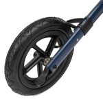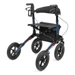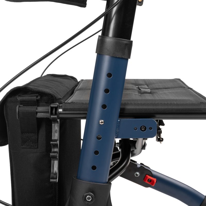 Solidna rama o zwiększonej odporności na nacisk osiowy zapewnia pewność i stabilność w trakcie poruszania się, nawet na bardziej wymagających nawierzchniach. Duże koła pneumatyczne o średnicy 12 cali skutecznie amortyzują wstrząsy i ułatwiają pokonywanie nierówności, takich jak krawężniki, kostka brukowa czy parkowe alejki. Dzięki temu balkonik sprawdza się w każdych warunkach pogodowych, oferując płynność ruchu oraz wysoki poziom bezpieczeństwa. Zastosowany podwójny system hamulców z blokadą postojową pozwala na pełną kontrolę nad podpórką i umożliwia bezpieczne zatrzymanie się, siadanie oraz wstawanie.