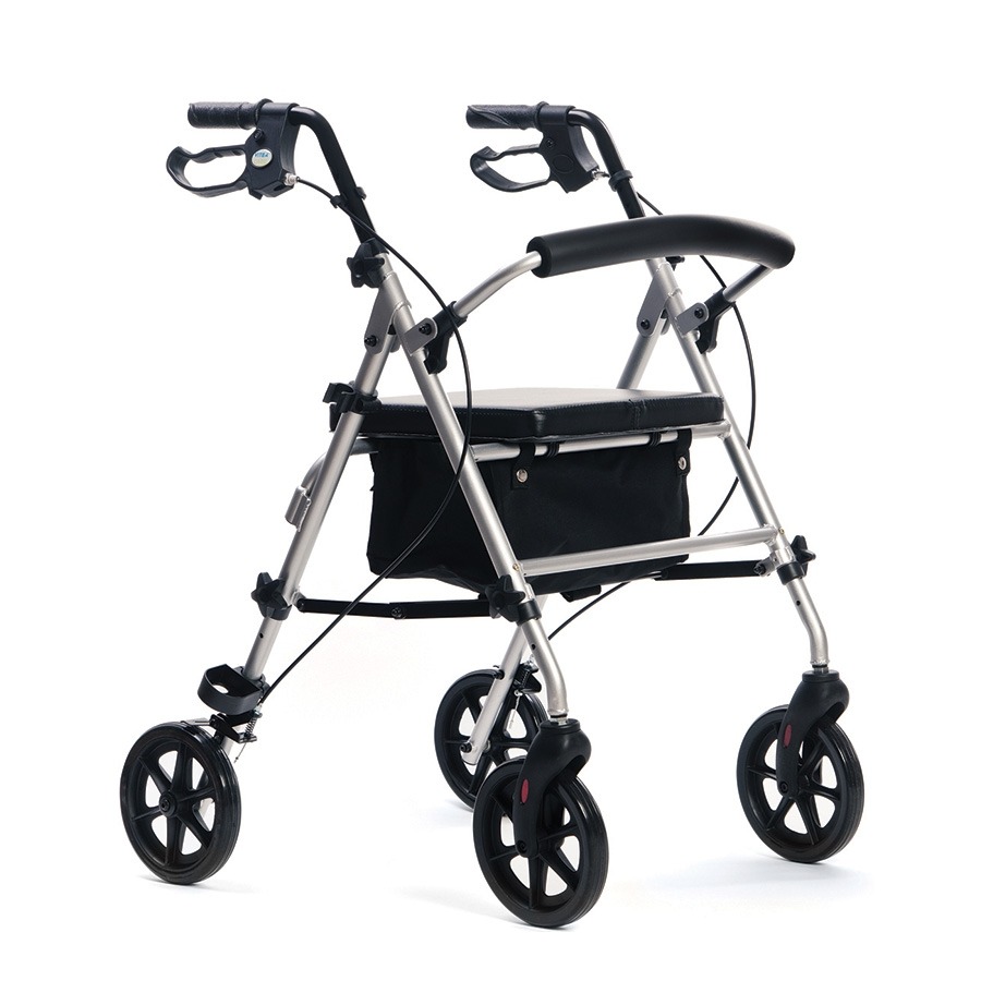 Balkonik Vitea Care Rocky Basic posiada cztery solidne koła o średnicy 190 mm, które zapewniają płynne i stabilne prowadzenie na różnych powierzchniach. Koła można w łatwy sposób zdemontować, co ułatwia transport i konserwację sprzętu. Dodatkowo hamulce z możliwością blokady gwarantują pełną kontrolę nad balkonikem, umożliwiając bezpieczne zatrzymanie w dowolnym miejscu. Użytkownik może również skorzystać z uchylnej barierki oparcia, która zwiększa komfort siedzenia, a pojemnik zakupowy pozwala na wygodne przewożenie drobnych przedmiotów podczas spaceru.