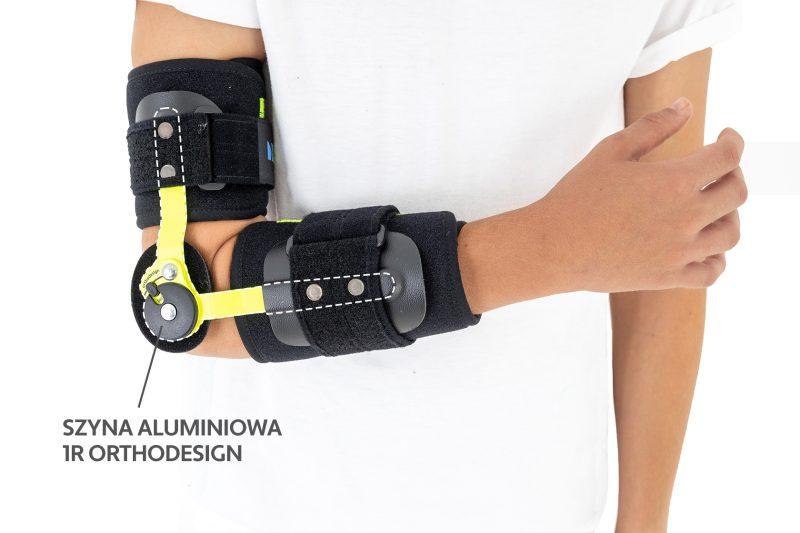 Fixcast FIX-KG-19 to innowacyjne rozwiązanie medyczne dedykowane najmłodszym pacjentom, którzy wymagają skutecznego unieruchomienia stawu łokciowego. Produkt ten znajduje szerokie zastosowanie w leczeniu zachowawczym po urazach takich jak złamania, zwichnięcia, skręcenia czy przykurcze tkanek miękkich w obrębie łokcia. Dzięki zaawansowanej konstrukcji oraz nowoczesnym materiałom, FIX-KG-19 skutecznie stabilizuje kończynę górną, umożliwiając bezpieczne i komfortowe leczenie. Jednym z kluczowych elementów ortezy jest boczna, aluminiowa szyna ortopedyczna 1R Orthodesign z kompaktowym zegarem 1R-01, który pozwala na precyzyjną regulację kąta zgięcia i wyprostu co 15 stopni. Regulacja odbywa się bez użycia narzędzi, przy pomocy magnesu i stalowych nitów, co jest szczególnie istotne w kontekście codziennego użytkowania przez dzieci. Szyna anatomicznie dopasowuje się do kształtu kończyny, zapewniając maksymalne bezpieczeństwo i stabilność.
