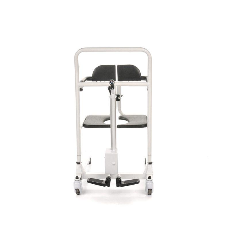 Solidna, stalowa rama malowana na biało gwarantuje trwałość i stabilność urządzenia, a jednocześnie estetyczny wygląd. Siedzisko podzielone na dwie części, wyposażone w otwór toaletowy, umożliwia korzystanie z podnośnika także podczas czynności higienicznych, co czyni go wyjątkowo funkcjonalnym. Oparcie zamykane metalowym zamkiem zapewnia bezpieczeństwo i stabilność pacjenta podczas transportu.