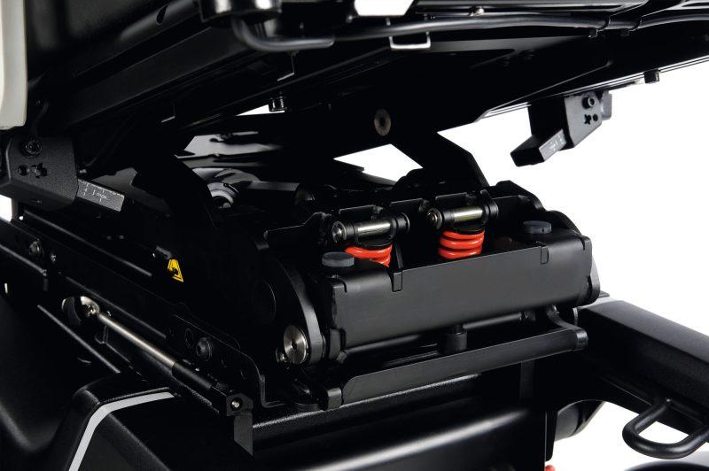 Amortyzowane zawieszenie. Oba koła napędowe są połączone drążkiem obrotowym, który pochłania naturalny ciąg w jedną stronę podczas szybkiej jazdy po pochyleniach i pokonywaniu zakrętów. Oba koła zachowują maksymalną przyczepność przez cały czas.