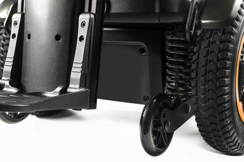 Wydajność na zewnątrz. Łatwo (i wygodnie) pokonuj przeszkody dzięki niezależnemu amortyzowanemu zawieszeniu wszystkich kół. Podczas pokonywania codziennych wybojów tylne ramiona kółek niezależnie poruszają się w górę i w dół, dzięki czemu zaawansowane elastomerowe zawieszenie pochłania wibracje. Ponieważ koła napędowe znajdują się z przodu, jesteś również ciągnięty przez większe przeszkody (zamiast silników popychających Cię), co zapewnia płynniejsze jazdę i dalszą redukcję wibracji. Dodatkowo, ponieważ z przodu jest większy ciężar, wózek jest bardziej stabilny, jeśli często jeździsz nim w dół.