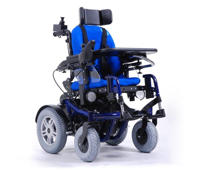 Nowoczesny wózek inwalidzki z napędem elektrycznym zaprojektowany dla dzieci.