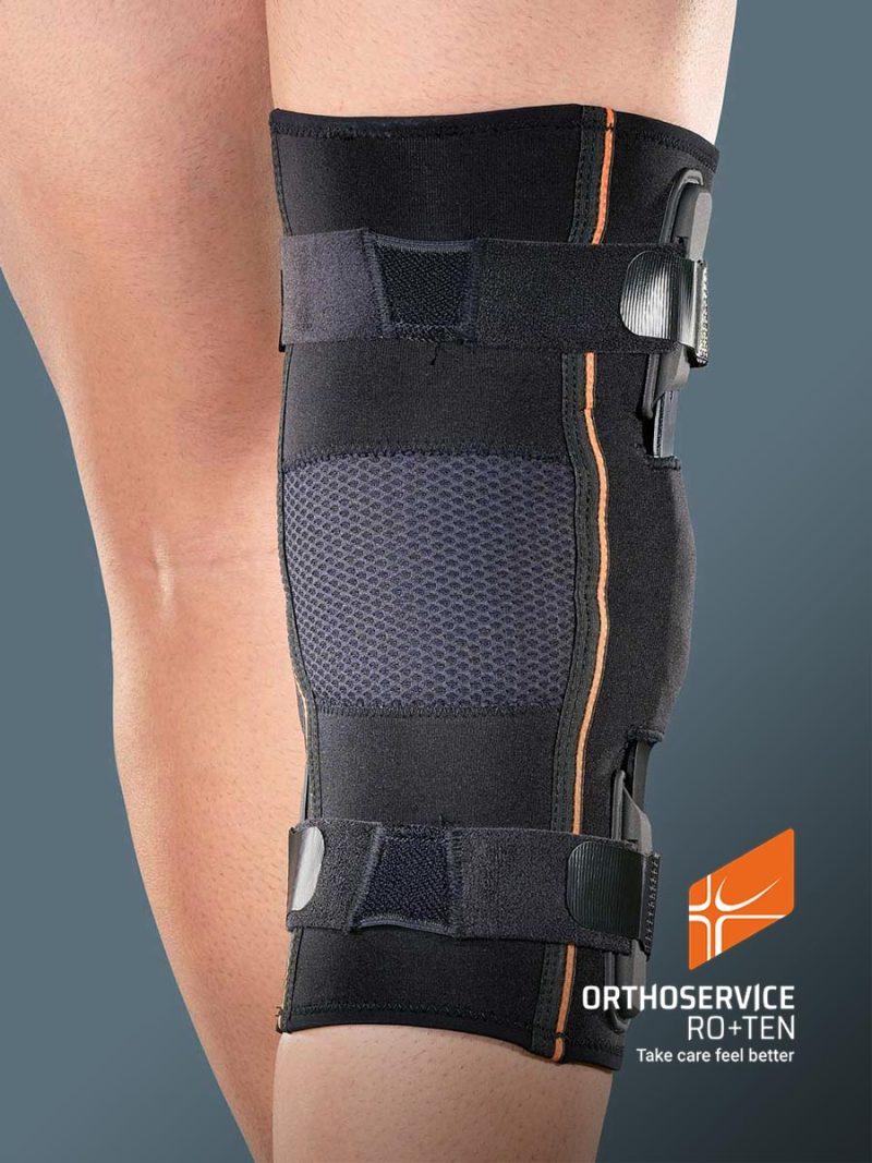 Orteza kolana z pierścieniem na rzepkę, z regulacją kąta zgięcia i wyprostu.