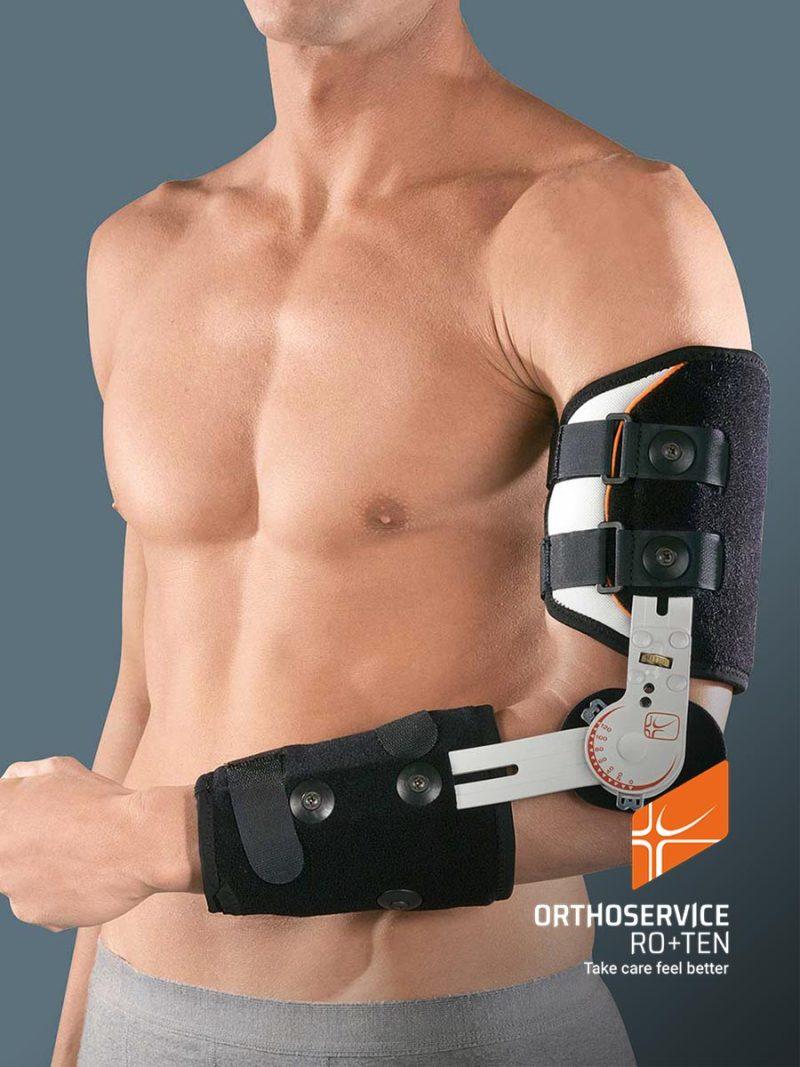 Orthoservice Elbo to orteza stawu łokciowego z zegarem z regulowanymi mankietami ramienia i przedramienia. Orteza posiada zintegrowane elementy z tworzywa sztucznego (PE) zapewniające idealne dopasowanie do anatomii pacjenta oraz wyściółkę z podwójnie sprzężonego MTP. Wyściółka z tkaniny jonizowanej srebrem od strony skóry jest antybakteryjna i antyzapachowa. Boczna szyna wykonana została z lekkiego stopu aluminium i połączona ze stalowym zawiasem. W przypadku tej ortezy możliwy jest regulowany wyprost od 0° do 90° co 10° oraz regulowane zgięcie od 0° do 120° co 10°. Istnieje także możliwość blokady zegara od 0° do 90° co 10°.