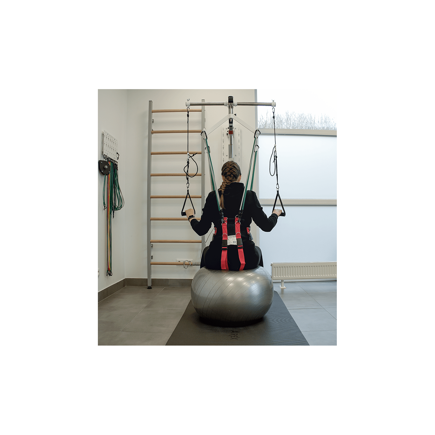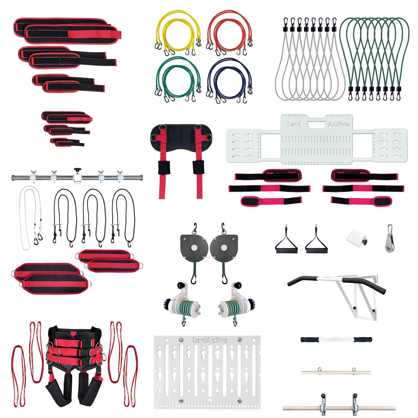 W skład zestawu LeviActive Q140 wchodzą wszystkie niezbędne elementy do kompleksowej terapii: rama LeviActive, podnośnik LeviCare Q140, dedykowany wieszak, zestaw gum do podwieszenia i ćwiczeń, różnego rodzaju uchwyty i drążki, ramię poprzeczne, podajniki, organizer, platforma na nogi, mankiety w różnych rozmiarach oraz podwieszka torso. Dzięki tak bogatemu wyposażeniu możliwe jest prowadzenie terapii dostosowanej do indywidualnych potrzeb pacjenta, a całość systemu staje się elastycznym i nowoczesnym narzędziem rehabilitacyjnym.