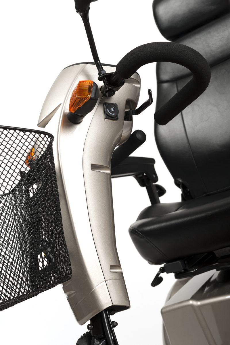 Fotel skuteru Vermeiren Ceres SE jest obracany, co ułatwia wsiadanie i wysiadanie z pojazdu. Dodatkowo, fotel można przesuwać w przód lub w tył, co umożliwia dopasowanie go do preferencji użytkownika. Skuter został również zaprojektowany z myślą o łatwym pchaniu w przypadku konieczności przemieszczania go ręcznie. Nachylana kolumna kierownicza, odchylane podłokietniki oraz lusterka wsteczne to kolejne udogodnienia, które zapewniają komfort i wygodę w trakcie jazdy.