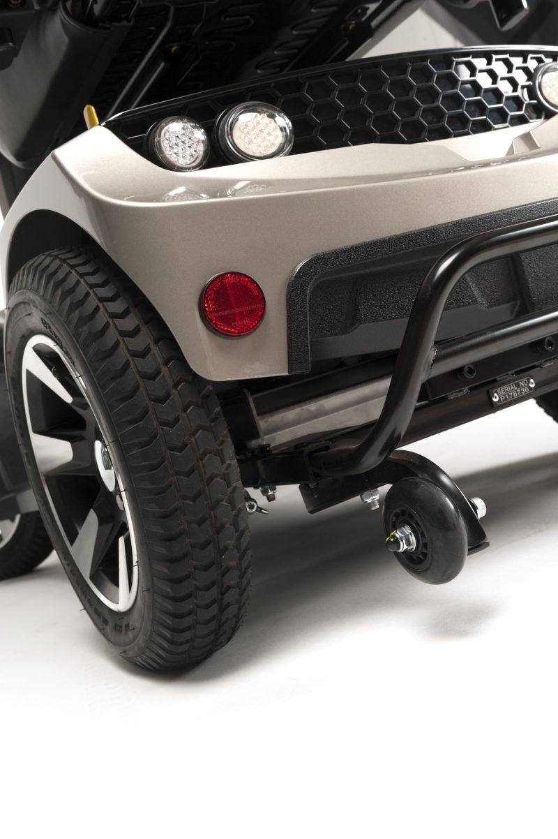 Nachylana kolumna kierownicza to kolejny element, który poprawia ergonomię jazdy i pozwala na precyzyjne manewrowanie skuterem w różnych warunkach. Odchylane podłokietniki dodatkowo zwiększają komfort użytkowania i umożliwiają wygodne podparcie rąk. Dzięki funkcji ręcznego pchania skuter może być przemieszczany bez użycia napędu, co przydaje się w sytuacjach awaryjnych lub podczas przechowywania.
