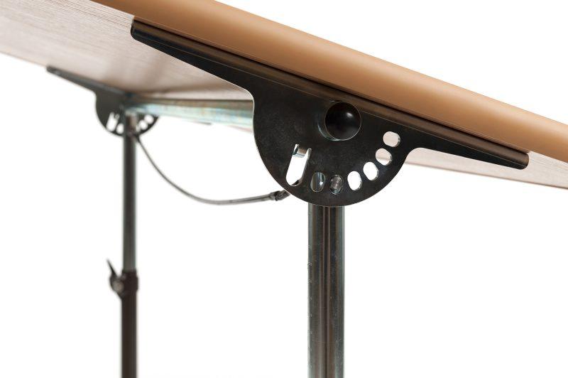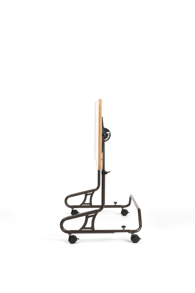 Drewniany stolik terapeutyczny z metalową ramą i szerokim spektrum ustawień pozycji nachylenia blatu.