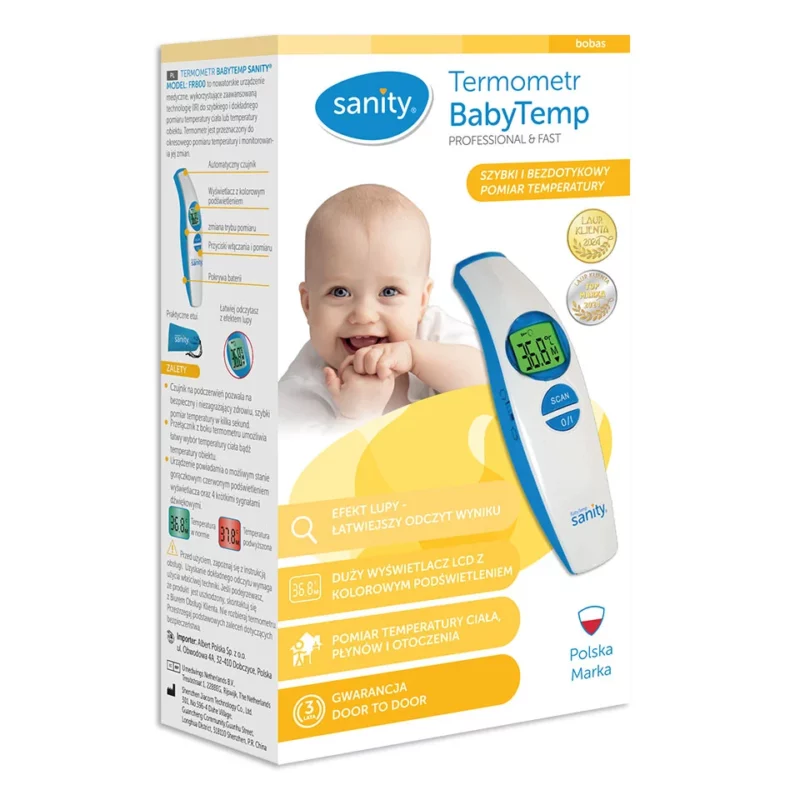 Sanity BabyTemp to nowoczesne i zaawansowane technologicznie urządzenie, które pozwala na szybki, precyzyjny oraz higieniczny pomiar temperatury bez konieczności bezpośredniego kontaktu z ciałem. Został zaprojektowany z myślą o najmłodszych dzieciach, które często nie tolerują tradycyjnych metod pomiaru temperatury. Dzięki wykorzystaniu technologii podczerwieni (IR) termometr umożliwia dokonanie pomiaru w ciągu zaledwie jednej sekundy, co znacząco ułatwia kontrolę stanu zdrowia malucha, nawet gdy śpi.