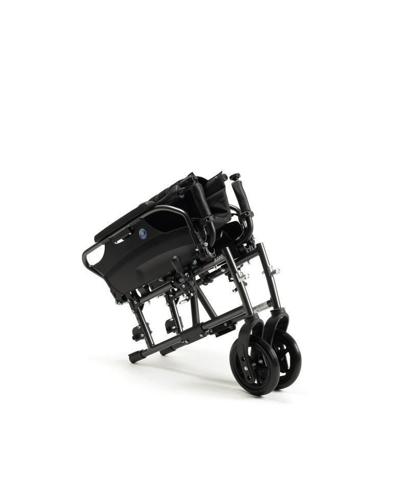 - Innowacyjne Rozwiązanie Konstrukcyjne: Model D200 30° posiada unikalne rozwiązanie konstrukcyjne, które pozwala na położenie oparcia na przedniej ramie podczas składania. Dzięki temu można zminimalizować wymiary wózka do transportu, co ułatwia jego przechowywanie i przemieszczanie.