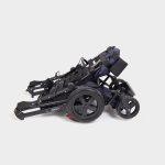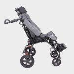 Wózek został wyposażony w regulowane oparcie, umożliwiające precyzyjną zmianę kąta jego pochylenia, co pozwala dostosować pozycję do aktualnych potrzeb użytkownika. Zastosowany system regulowanych taśm sprawia, że oparcie może być indywidualnie dopasowane do krzywizn kręgosłupa, zapewniając odpowiednie podparcie oraz komfort nawet podczas długotrwałego siedzenia. Regulacji podlegają również siedzisko oraz podnóżek, przy czym zastosowana płynna i bezpunktowa regulacja umożliwia ustawienie elementów w dowolnym zakresie bez skokowych przestawień. Rozwiązanie to znacząco zwiększa precyzję dopasowania, minimalizuje niepożądane mikroruchy i poprawia ogólną stabilność pozycji.