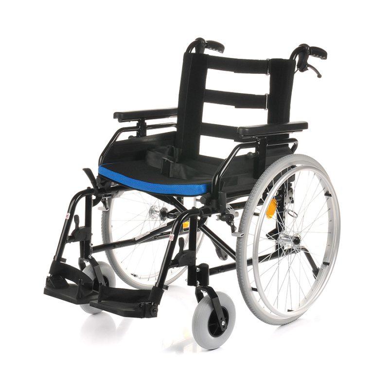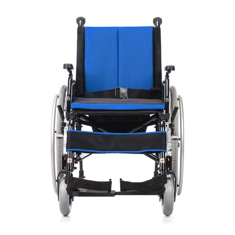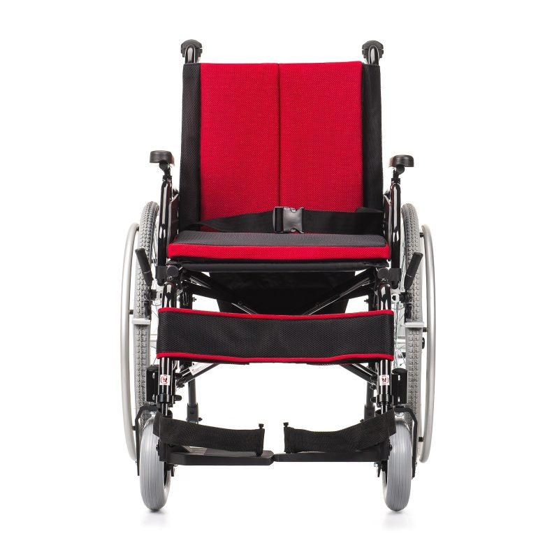 Boczki wózka są odchylane i wyjmowane, co ułatwia przesiadanie, a uchylne, demontowalne podnóżki z możliwością regulacji wysokości oraz kąta nachylenia platformy pozwalają na dostosowanie pozycji nóg do indywidualnych potrzeb. Siedzisko ma regulowany kąt nachylenia dzięki możliwości ustawienia kół przednich i tylnych, a podłokietniki można regulować na wysokość. Pas zabezpieczający pod łydki stabilizuje nogi, natomiast pas biodrowy chroni przed wypadnięciem.