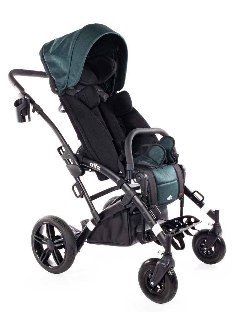 Wózek ALFA wyróżnia się także bogatym podstawowym wyposażeniem. Zawiera on pochylane oparcie, które pozwala na zmianę pozycji od siedzącej aż do pełnego leżenia, amortyzację na wszystkich czterech kołach oraz blokadę kierunkową jazdy, co znacząco poprawia komfort prowadzenia. Regulowany podnóżek umożliwia dopasowanie do długości nóg dziecka, a centralny hamulec zwiększa bezpieczeństwo podczas postoju. W standardzie znajdują się także regulowana budka z okienkiem, uchwyt na butelkę, pasy pięciopunktowe, barierka zabezpieczająca oraz pasy odwodząco-stabilizujące. Stabilizację na poziomie tułowia zapewniają regulowane peloty biodrowe i piersiowo-lędźwiowe, a boczne elementy oparcia oraz zagłówek dodatkowo wzmacniają prawidłową pozycję dziecka w siedzisku.